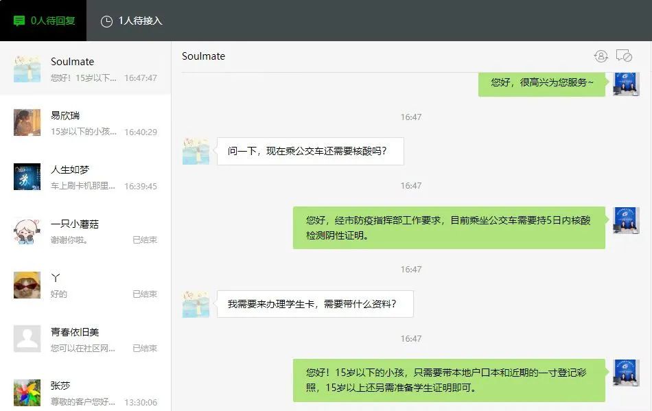 8月份升級(jí)開(kāi)通網(wǎng)絡(luò)人工客服,市民通過(guò)荊門(mén)公交微信公眾號(hào),與人工客服1號(hào)、2號(hào)坐席進(jìn)行溝通,建立起集咨詢、尋物、建議、投訴等一體化的綜合在線服務(wù)。