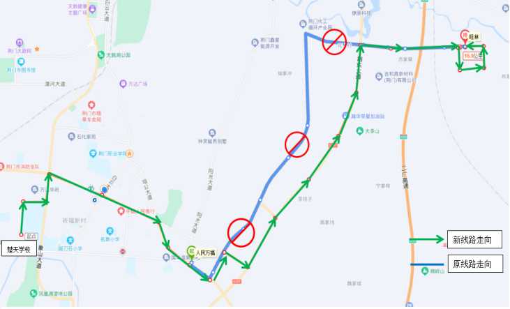 一.優(yōu)化調(diào)整33路公交線路走向 ◆首末站:楚天學(xué)?!郑ㄐ】的下繁保?/p> ◆首末班時(shí)間:6:50—17:45 ◆線路走向:響嶺路—運(yùn)動(dòng)公園路—象山大道—深圳大道—培公大道—荊和大道—深圳大道—荊東大道—興化三路—格林北路—興化四路—小康南路 ◆??空军c(diǎn):楚天學(xué)校、雙喜街辦、運(yùn)動(dòng)公園路、萬達(dá)廣場(chǎng)、掇刀檢察院、掇刀法院、掇刀公安分局、南城明珠、中國人民銀行、市氣象局、襄荊高速、雙泉社區(qū)、人民萬福商貿(mào)城、人民一品花園、虎頭山、殯儀館、馮廟村、固潤科技、東方雨虹、圣通石化、荊東消防、荊東大道興化五路口、潤都制藥、興化三路西、興化三路中、興化三路盈德氣體、紐蘇萊、旺林、興化四路、小康南路北。 ◆取消原33路途經(jīng)荊和大道等路段站點(diǎn):荊和大道南、陽光五路、陽光四路、陽光三路、化工產(chǎn)業(yè)園行政大樓。 二.優(yōu)化調(diào)整69路公交發(fā)班時(shí)間 ◆調(diào)整前 園博園東門發(fā)班時(shí)間:6:40、7:40、15:30、16:30、17:15 玲瓏輪胎發(fā)班時(shí)間:7:30、8:30、16:30、17:30、18:00 ◆調(diào)整后 園博園東門發(fā)班時(shí)間:6:40、7:20、15:30、16:30 玲瓏輪胎發(fā)班時(shí)間:7:30、8:20、12:20、16:20、17:30